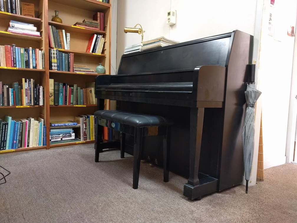 Turns out the store had an original brown-tiled bench behind a couple of bookcases. Who knew? We repurposed the bookshelf beside it to store cups and glassware and plates. We got a coffee machine and some tea pots (a precursor to actually selling these things, imagine: you can get them for free most days at present).