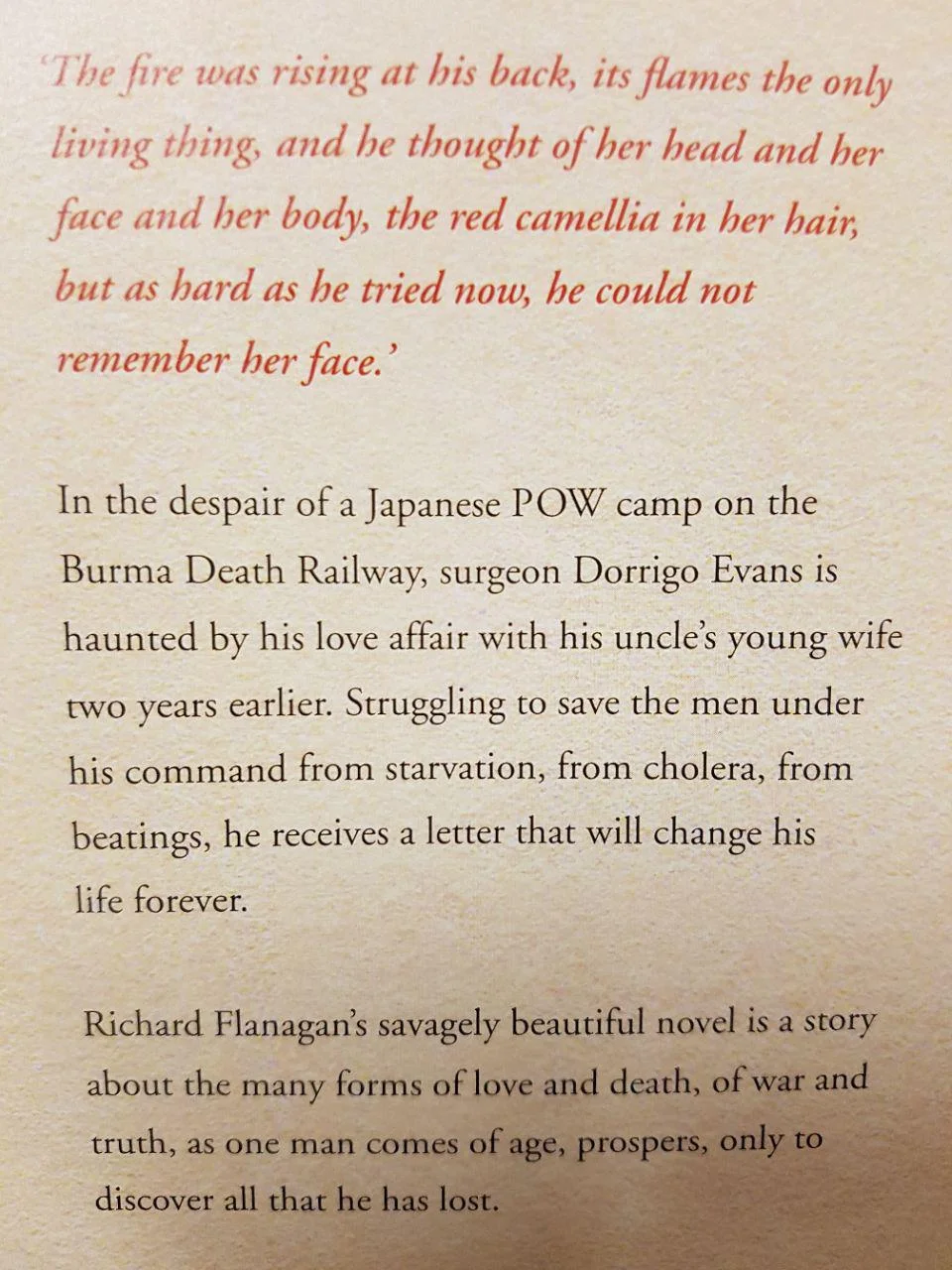 War, love, Australia, Burma, horror April 6, 2017 Hayden Glass Richard Flanagan's Narrow Road to the Deep North has all that and more. In hardback for $10. View fullsize View fullsize